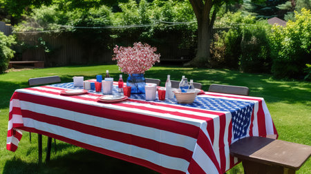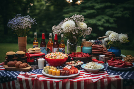 A festive Independence Day barbecue setup in backyard with American decorations and a variety of food. 4th of July, american independence day, happy independence day of america, memorial day concept