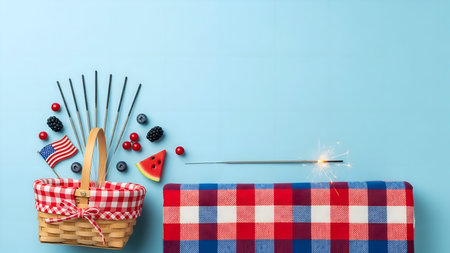 A festive picnic basket adorned with an American flag, filled with fresh fruits like watermelon, blueberries, and raspberries, accompanied by a sparkler on a checkered blanket.