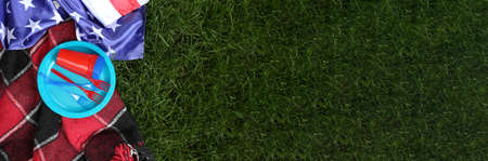 July 4, Independence Day traditional American picnic background. Plates, glasses, USA flags on green lawn or meadow grass, with blanket or tablecloth for picnic, sunglasses, copy space top view. Election Day in the USA. America Day.