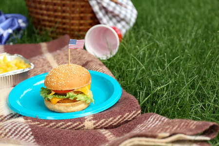 Dinnerware with American flag on plaid in park, copy text space