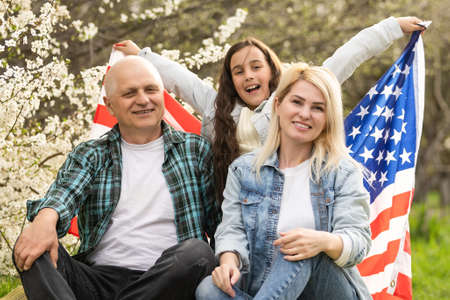 american family with USA flag outdoors.