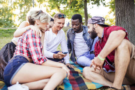 Best multiracial friends are on picnic in the park. One of the friends make selfie by smartphone.