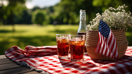 Bottle of cola with american flags on picnic tablecloth