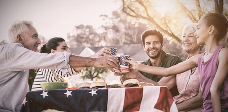 Happy family having a picnic and making a toast on an american tableclothe