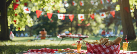 Canada Day background with a bright, festive picnic scene in a park, complete with Canadian flags and decorations.