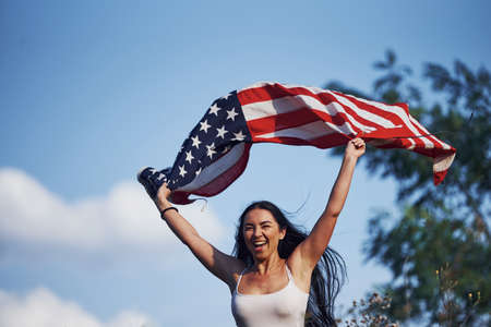 American flag outdoors. Woman holds usa national flag against blue cloudy sky. 4th July Independence Day