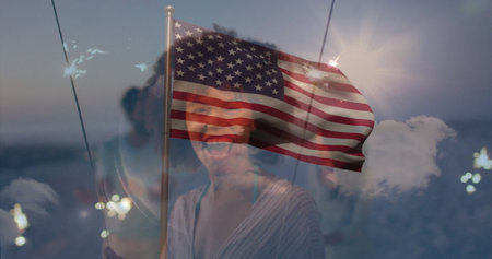 Image of flag of usa over caucasian woman. Patriotism and celebration concept digitally generated image.