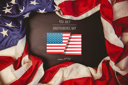 Independence day graphic against american flag on chalkboard