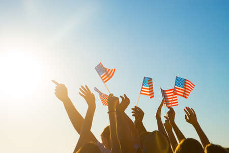 Group of people waving the american flag on blue sky background.