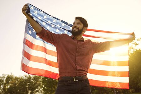Patriotic holiday July 4th Independence Day of America. Man bearded man with the American flag in his hands at sunset in the sun. USA celebration.