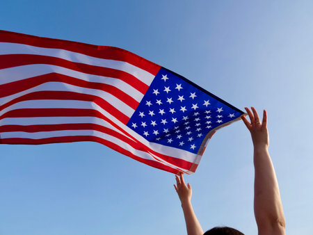 Raised hand with waving American flag against blue sky. Celebration of Independence day, 4th July, Memorial Day, American Flag Day, Labor day party event