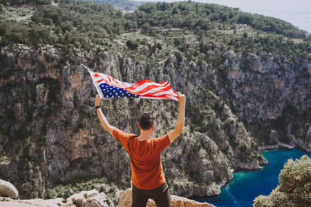 Young man standing on a rock cliff and waving the US flag while looking at sea beneath. Veteran traveller waving the American flag while standing on a mountain top. 4 fourth July Independence Day