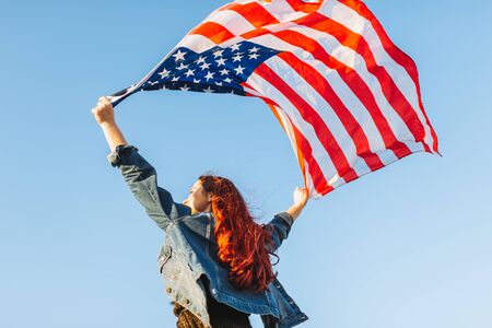 Red hair young woman standing facing the sky with her hands holding usa flag for freedom concept. 4th of July, Independence day