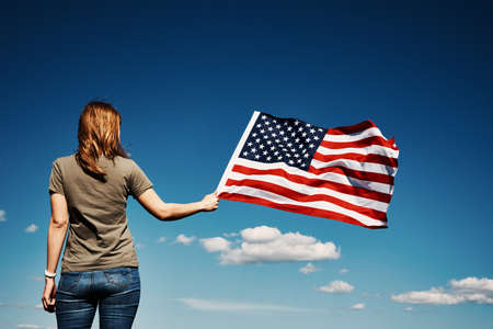 American flag outdoors. Woman holds usa national flag against blue cloudy sky. 4th July Independence Day