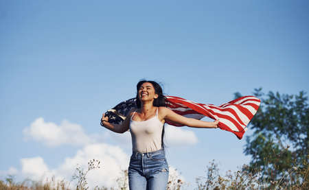 Female patriot runs with USA flag in hands outdoors in the field against blue sky.
