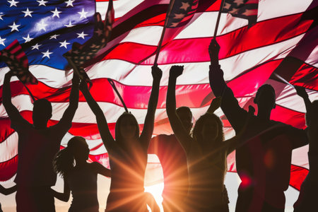 Patriotic holiday. Silhouettes of people holding the Flag of USA. America celebrate 4th of July.