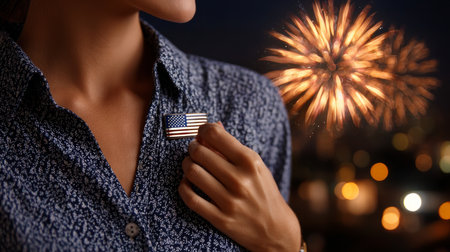 Close-up of an American flag pin on a person's shirt, with fireworks in the background. Election Day in the USA. America Day. Festive Mood on President's Day.