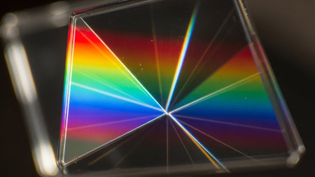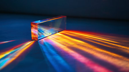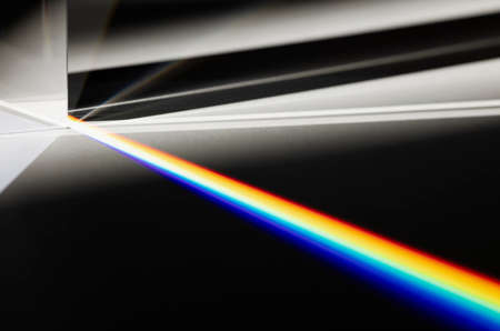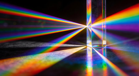 A glass prism refracts light, creating a vibrant spectrum of rainbow colors fanning out from its center.