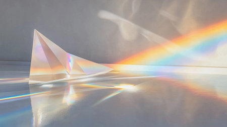 A stunning glass prism casting vibrant rainbow reflections on a surface, creating a mesmerizing pattern of colors and light. Perfect for artistic projects.