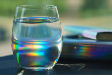 Transparent glass filled with water reflecting rainbow spots from a notebook in silver holographic cover