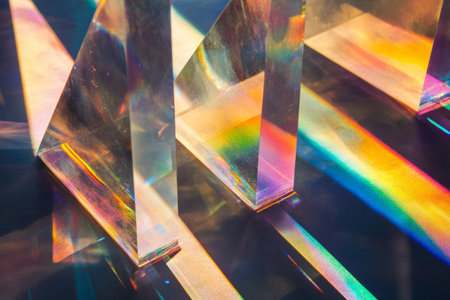 Glass prisms reflecting vibrant rainbow beams on a surface during daylight