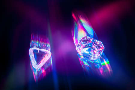 Abstract background with glass geometric figures prisms with light diffraction of spectrum colors and complex reflection. Real photo