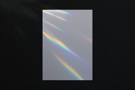 Empty white vertical rectangle a4 poster, business card, flyer mockup with overlay of rainbow light refraction caustic effect and shadow on trendy dark concrete background.