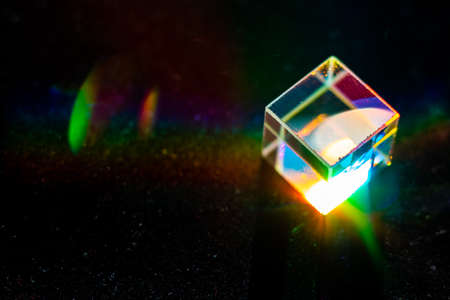 Glass cube with color spectrum rays. Abstract background with reflection and refraction of light.