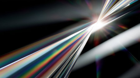 A creative digital illustration depicting High quality digital art of rainbow prism light refraction background on black, spectral color bands, iridescent magical mood, sharp focused rays. This AI-generated artwork features unique visual elements suitable for various commercial and editorial applications. AI-generated illustration.