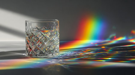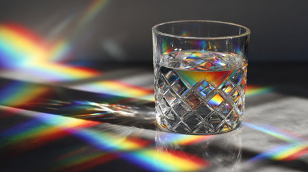 A delicate glass filled with clear water casts shimmering rainbow hues onto a polished surface, illuminated by gentle natural light and featuring elaborate patterned deta