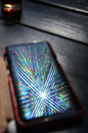 Bright rainbow rays reflect in mobile phone screen surface with blurred background. Multicolored beams and reflection atop smartphone screen closeup