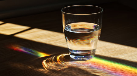 A clear glass of water sits on a wooden surface, catching sunlight and creating a beautiful rainbow reflection, showcasing a stunning blend of colors in a serene setting.
