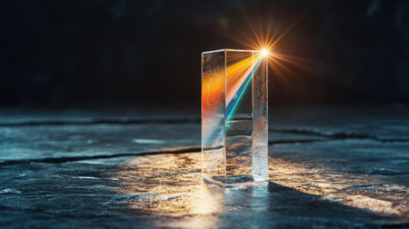 A clear crystal prism refracts light, casting a brilliant rainbow spectrum onto a dark, textured surface.