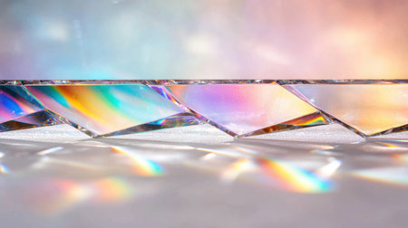 A glass prism sits on colorful geometric designs, casting a beautiful rainbow across the surface. This scene captures the magic of light as it interacts with shape and color in an artistic setting.