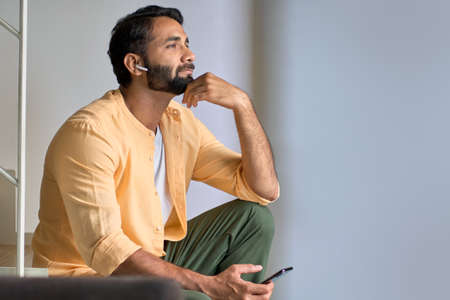Indian man sitting at home wearing earbuds using mobile phone listening podcast.