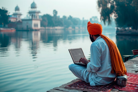 Amritsar, India - November 21, 2011: The Sikh pilgrims meditates on the Amrit Sarovar lake in the Golden Temple complex. Amritsar, Punjab, India.
