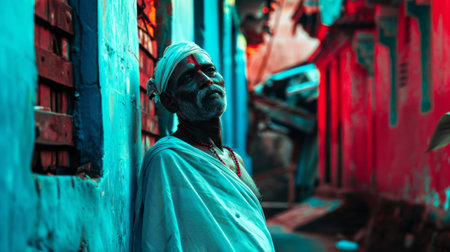 A joyful elderly man wearing traditional orange attire and a long white beard smiles warmly. His vibrant expression captures the essence of cultural heritage and spirituality.