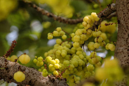 Star gooseberry fruit. Phyllanthus acidus,bunch gooseberry in garden background