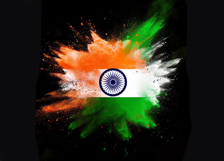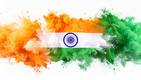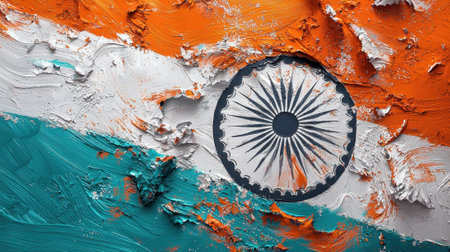 Bright colors of orange, white, and green blend together in a textured representation of India's national flag. The Ashoka Chakra stands out at the center, symbolizing progress and unity.