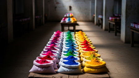 Macro close up of vibrant colorful rangoli pigment powders textures in piles, realistic Diwali festival decoration detail,