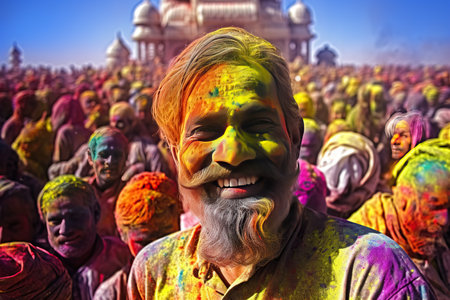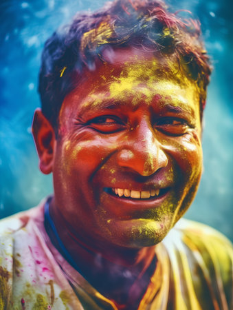 A vibrant portrait of a man celebrating Holi, the Hindu festival of colors. His face is covered in bright powder.