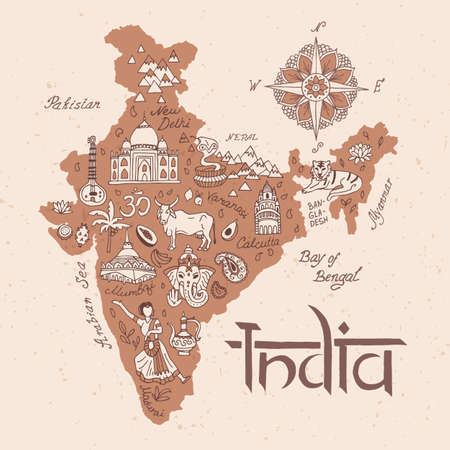 Vector hand drawn stylized map of India. Travel illustration. Republic of India geography illustration. Asia map elements