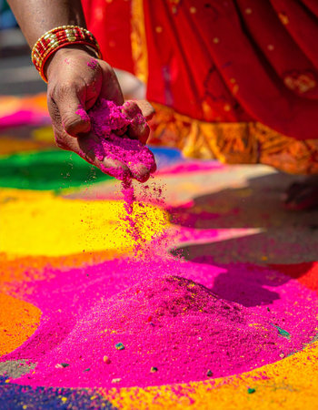A woman's hand, adorned with traditional bangles, delicately sprinkles vibrant pink powder, adding the final touches to a beautiful rangoli.