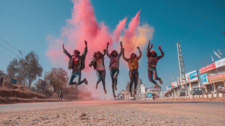 A lively scene captures a group of friends joyfully jumping amidst vibrant colored powders during a festive celebration. Pure energy and excitement!