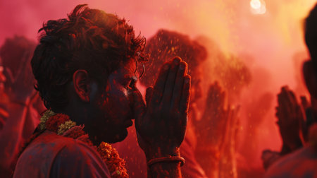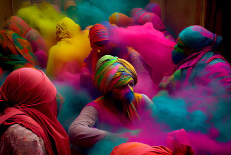 Hindu people with colorful starch powder in Holi festival or festival of colors. Generative AI
