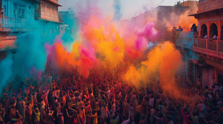 Holi celebration illustration, holiday festive. Colorful paint and powder generative ai.