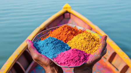 Close-Up of Hands Holding Vibrant Holi Powder on a Boat. Concept of Cultural Celebration, Colorful Traditions.
