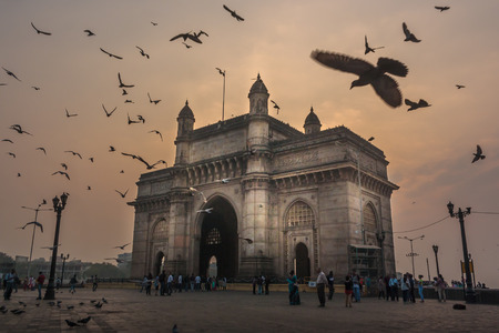 MUMBAI, INDIA - JANUARY 14, 2017 - Unidentified people walk and pigeons fly around the Gateway of India