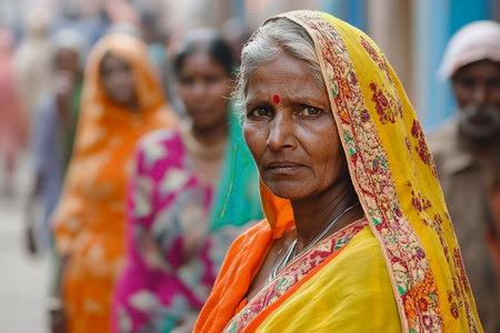 Indian woman in a vibrant, gold-embroidered sari, adorned with traditional jewelry, amidst busy streets.