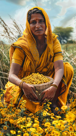 Portrait of a smiling Indian woman florist wearing a sari, surrounded by bright yellow marigold flowers